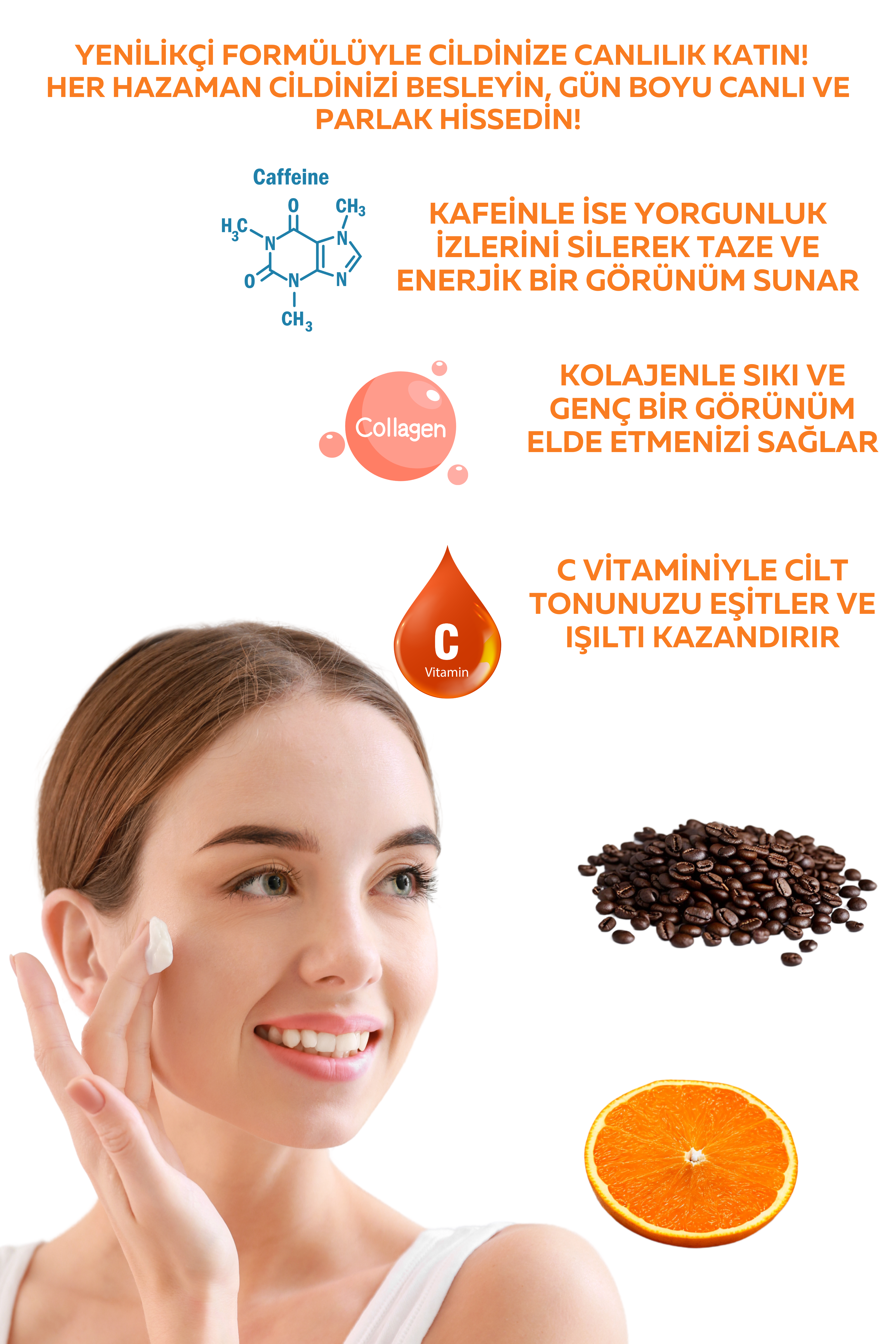 HER HAZAMAN CİLDİNİZİ BESLEYİN, GÜN BOYU CANLI VE PARLAK HİSSEDİN! C VİTAMİNİYLE CİLT TONUNUZU EŞİTLER VE IŞILTI KAZANDIRIR KOLAJENLE SIKI VE GENÇ BİR GÖRÜNÜM ELDE ETMENİZİ SAĞLAR KAFEİNLE İSE YORGUNLUK İZLERİNİ SİLEREK TAZE VE ENERJİK BİR GÖRÜNÜM SUNAR