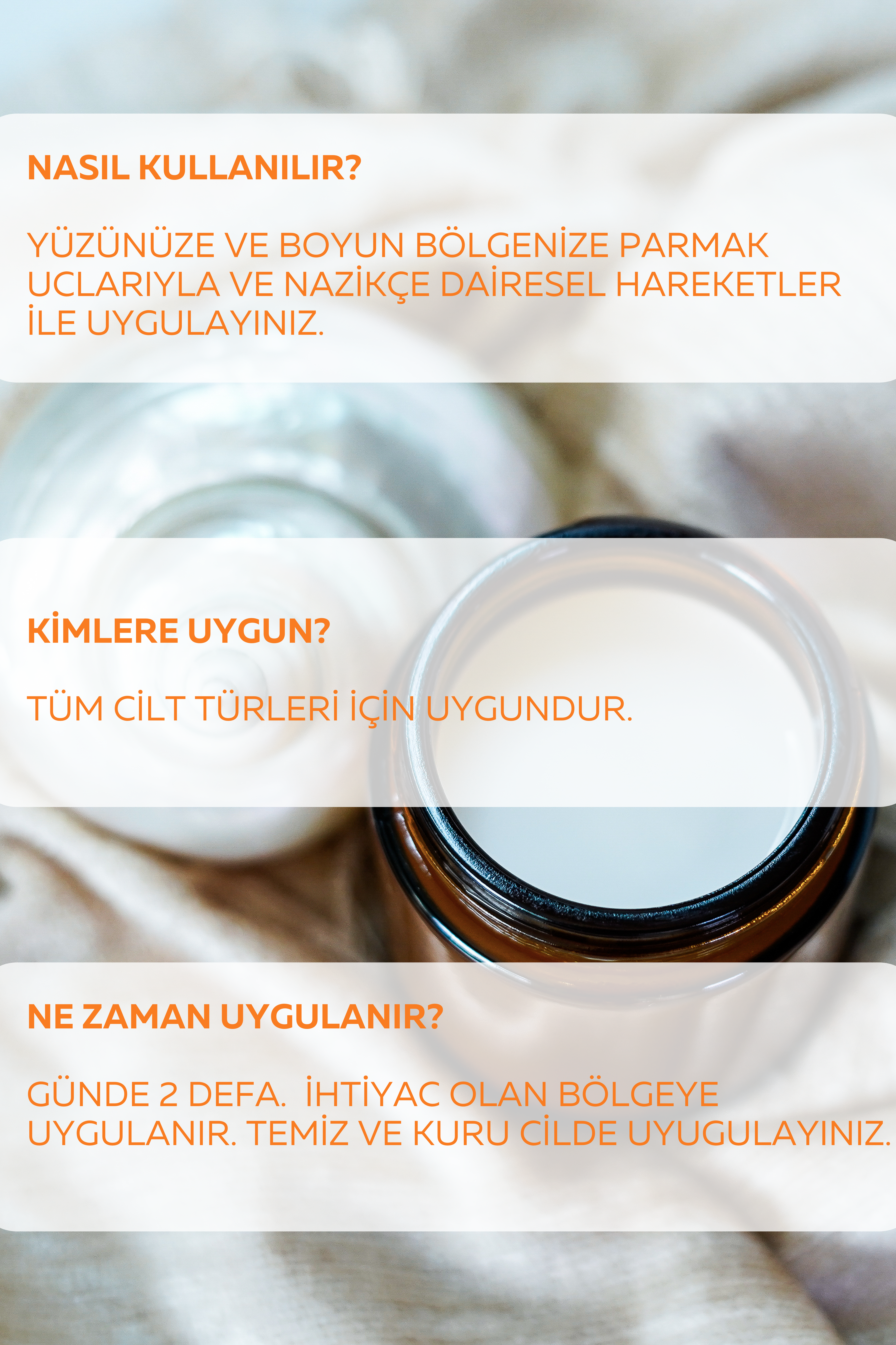 YÜZÜNÜZE VE BOYUN BÖLGENİZE PARMAK UCLARIYLA VE NAZİKÇE DAİRESEL HAREKETLER İLE UYGULAYINIZ.
