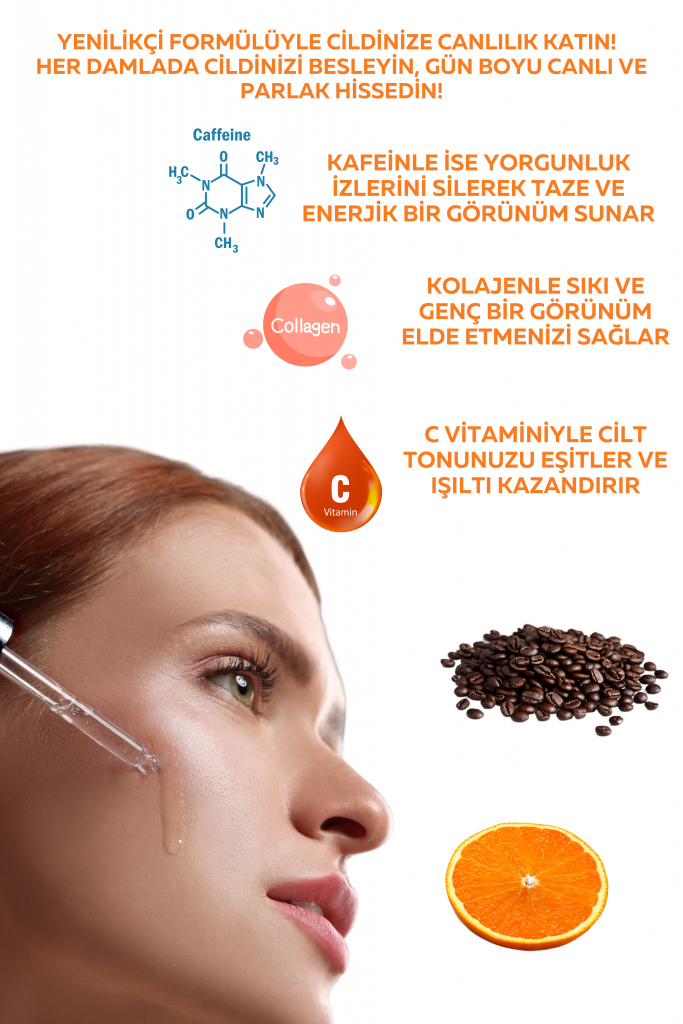 YENİLİKÇİ FORMÜLÜYLE CİLDİNİZE CANLILIK KATIN! HER DAMLADA CİLDİNİZİ BESLEYİN, GÜN BOYU CANLI VE PARLAK HİSSEDİN! C VİTAMİNİYLE CİLT TONUNUZU EŞİTLER VE IŞILTI KAZANDIRIR KOLAJENLE SIKI VE GENÇ BİR GÖRÜNÜM ELDE ETMENİZİ SAĞLAR KAFEİNLE İSE YORGUNLUK İZLERİNİ SİLEREK TAZE VE ENERJİK BİR GÖRÜNÜM SUNAR