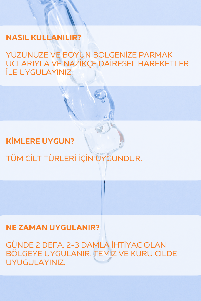 GÜNDE 2 DEFA. 2-3 DAMLA İHTİYAC OLAN BÖLGEYE UYGULANIR. TEMİZ VE KURU CİLDE UYUGULAYINIZ
